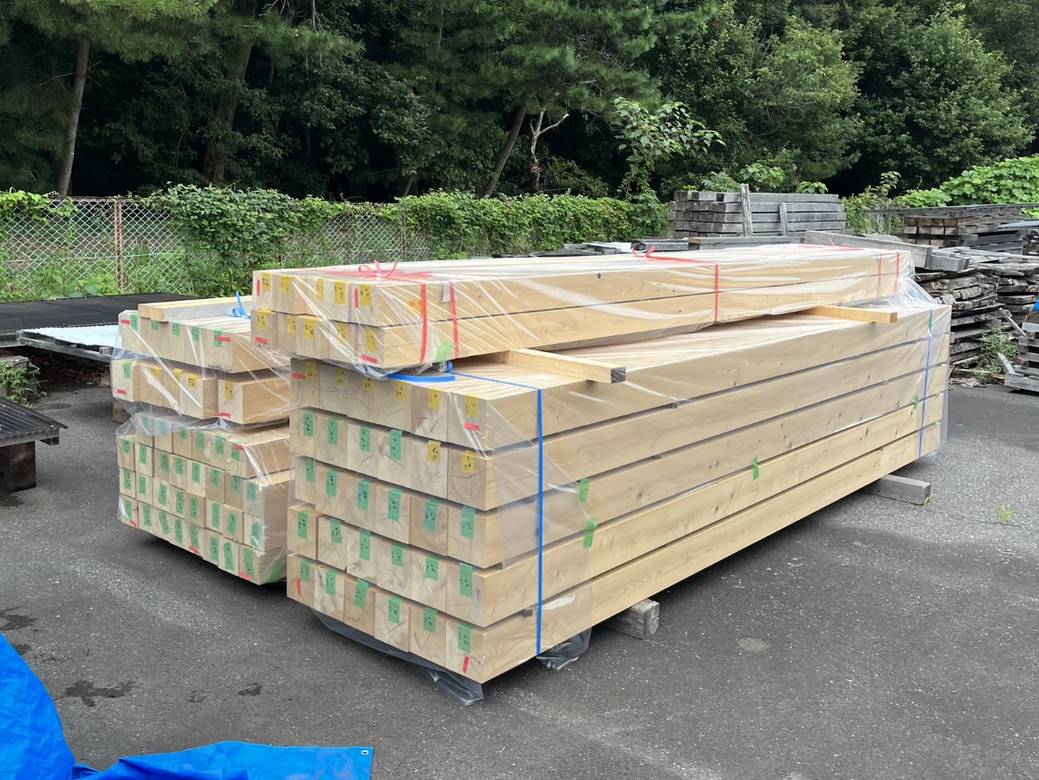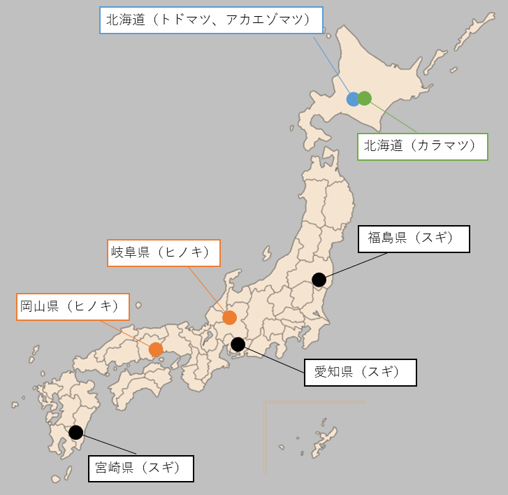 スギ、ヒノキ、カラマツ、トドマツ、アカエゾマツの正角乾燥材を、図1に示す地域から調達した(写真2-1、2-2、2-3、2-4)。材長は約3 mもしくは約4 m、断面寸法は105mm角(105mm×105mm)、120mm角(120mm×120mm)、150mm角(150mm×150mm)であり、樹種と調達先、断面寸法の組み合わせは表1のとおりである。木取りについては利用実態を踏まえてスギ、ヒノキ、カラマツは心持ち、トドマツ、アカエゾマツは心去りとした。試験体数は、各樹種、各断面寸法に対して検量線作成用10本と検証用30本とした。ただし、調達の都合からトドマツ150mm角は検量線作成用9本と検証用27本となった。![]() 図1 各樹種の試験体の調達先 |