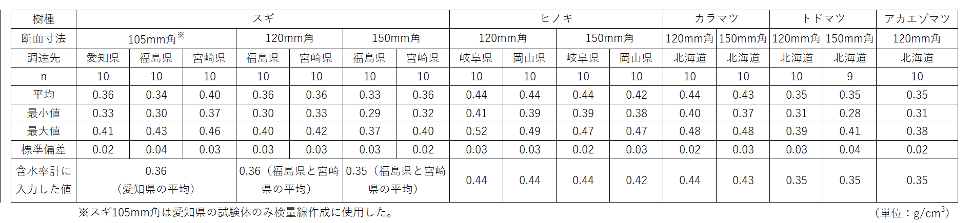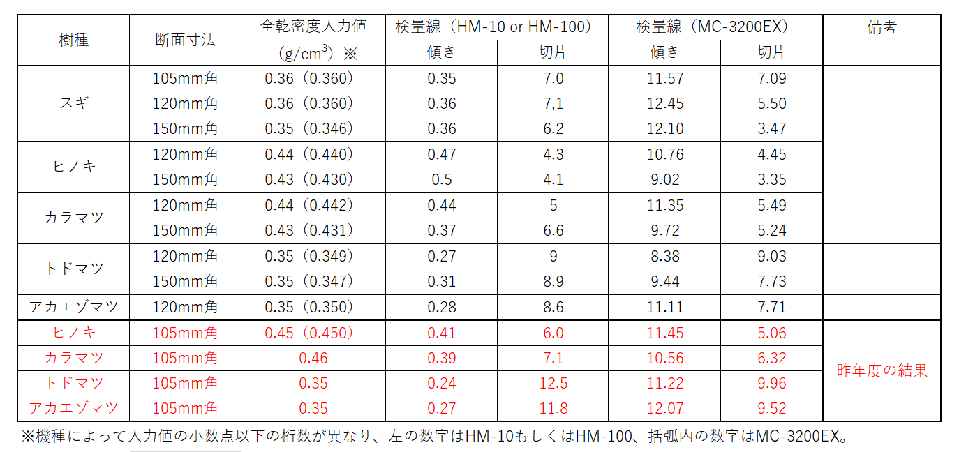 スギ、ヒノキ、カラマツ、トドマツ、アカエゾマツの120mm角および150mm角(アカエゾマツは120mm角のみ)の正角乾燥材を対象に、マイクロ波透過型含水率計(HM-10、HM-100、MC-3200EX)を用いて検量線を作成し、得られた検量線を表3に整理した。表3 含水率計に入力した全乾密度の値と検量線の情報![]() |