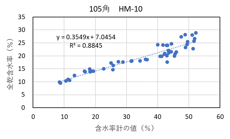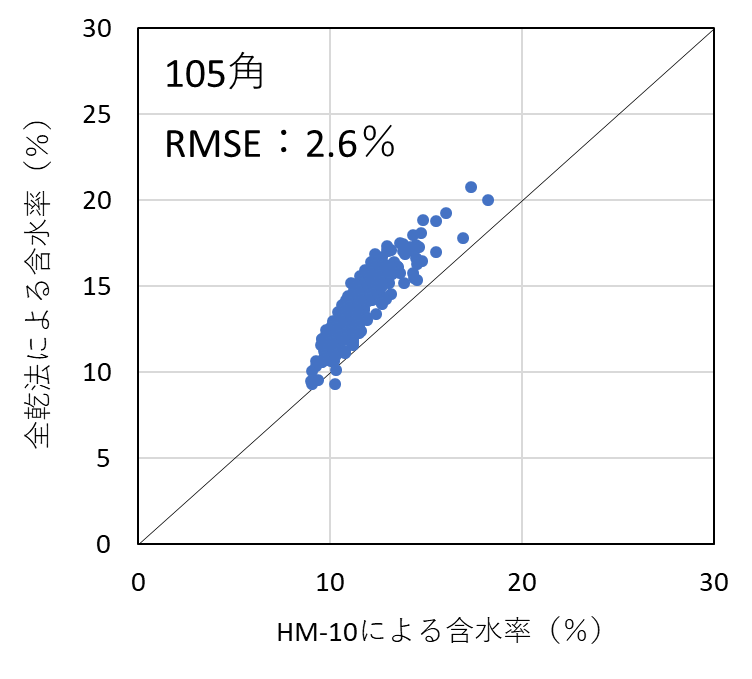 ![]() 図4-1 105角スギ検証用試験体の各切片に対する含水率計(HM-10)による測定値と全乾法による含水率の関係 |