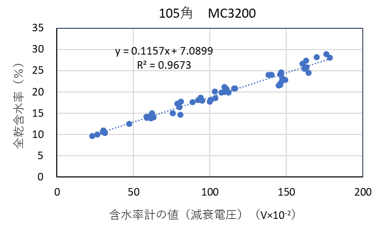![]() 図3-2 検量線作成用試験体の各切片に対する含水率計(MC-3200EX)の値と全乾法による含水率の関係(スギ105角) |