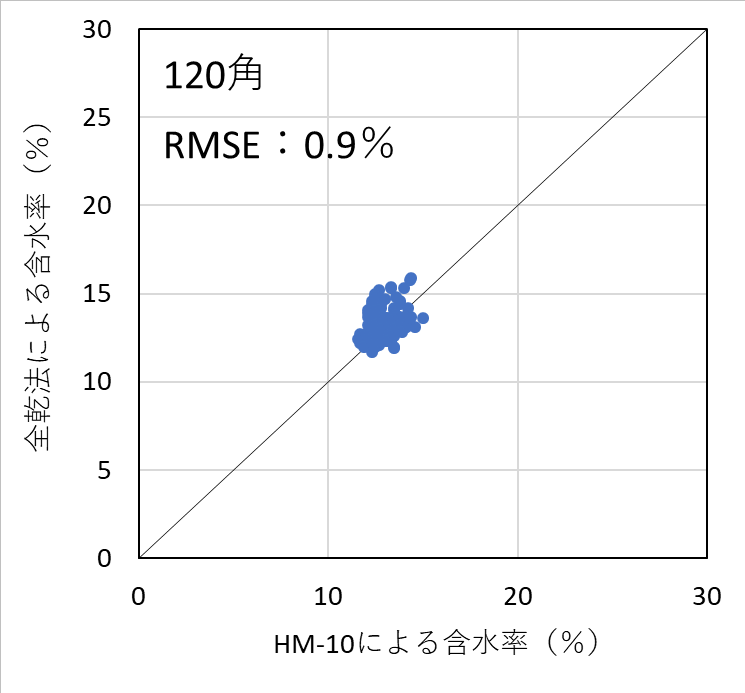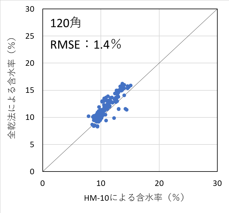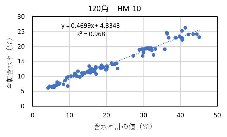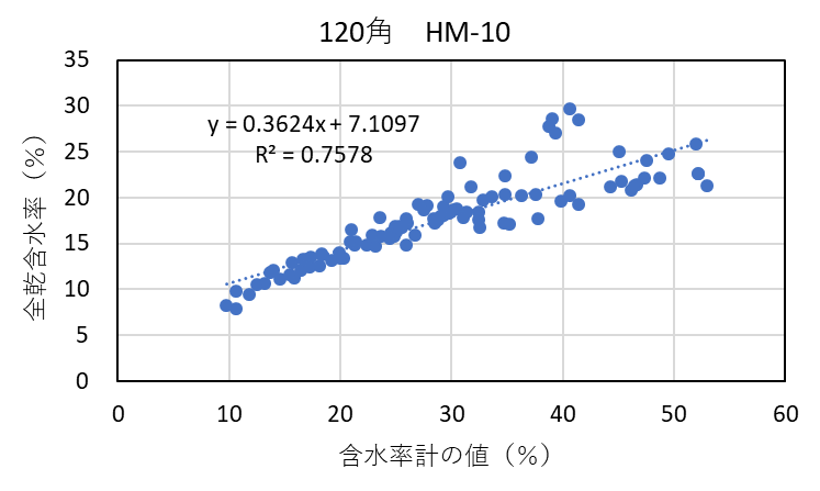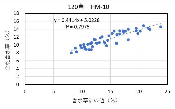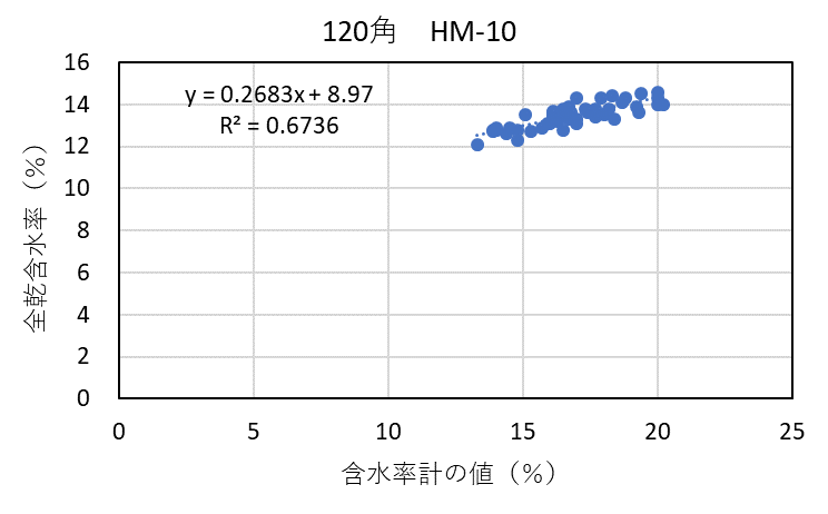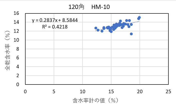 ![]() 図4-19 120角アカエゾマツ検証用試験体の各切片に対する含水率計(HM-10)による測定値と全乾法による含水率の関係 |