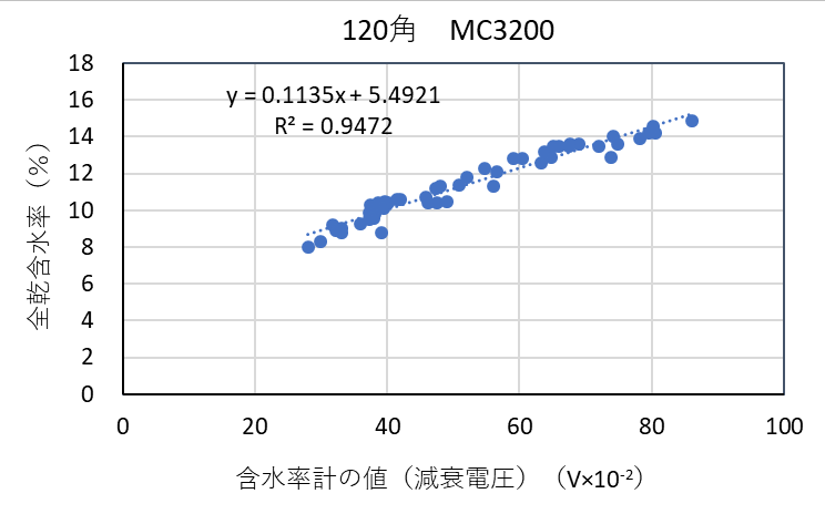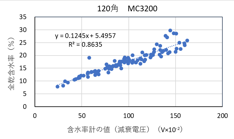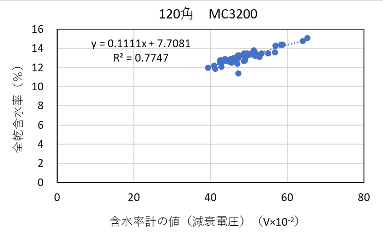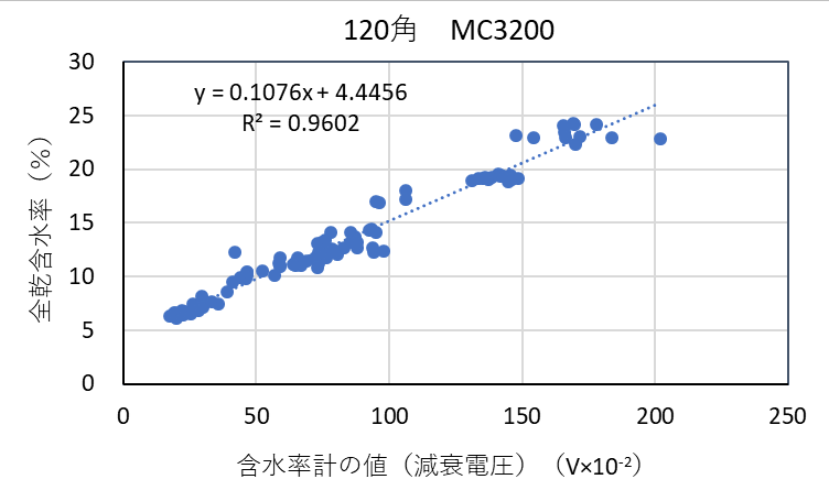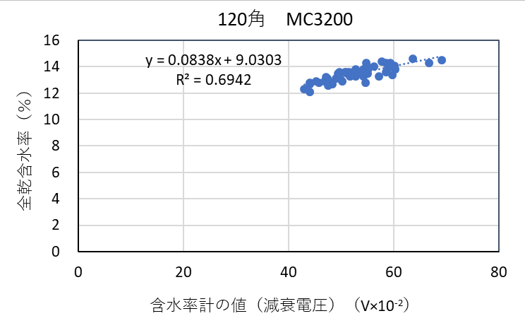 ![]() 図3-12 検量線作成用試験体の各切片に対する含水率計(MC-3200EX)の値と全乾法による含水率の関係(カラマツ120角) |