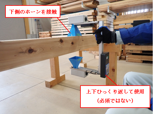 携帯型のマイクロ波透過型含水率計3機種、HM-10(マイクロメジャー(株)製)、HM-100(マイクロメジャー(株)製)およびMC-3200EX((株)エーティーエー製)を含水率測定試験に使用した(写真1-1、1-2、1-3)。いずれも針葉樹製材に用いる携帯型の含水率計として(公財)日本住宅・木材技術センターの認定機種となっている。実際の測定時の様子を写真1-4、1-5、1-6に示す。