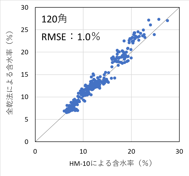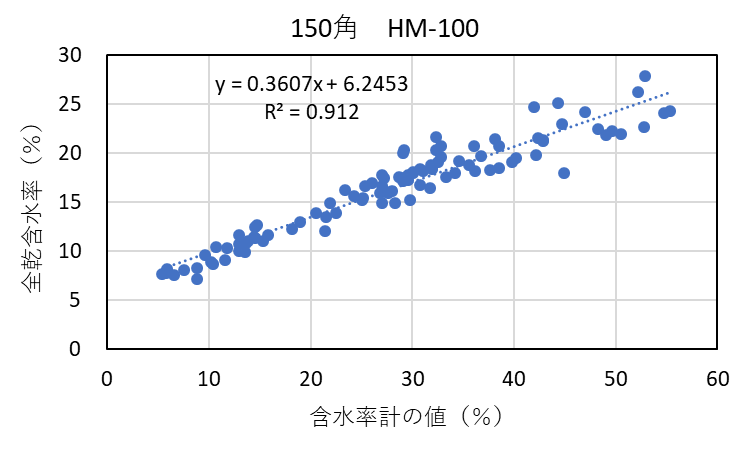 ④ ②で測定した含水率計の値と全乾法による含水率との関係を散布図に示し、その直線回帰式を検量線とした。