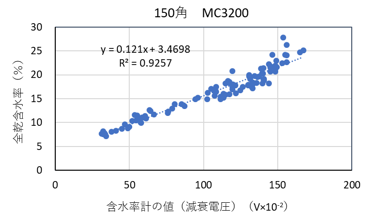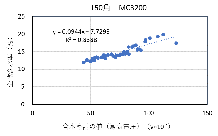 ![]() 図3-14 検量線作成用試験体の各切片に対する含水率計(MC-3200EX)の値と全乾法による含水率の関係(カラマツ150角) |