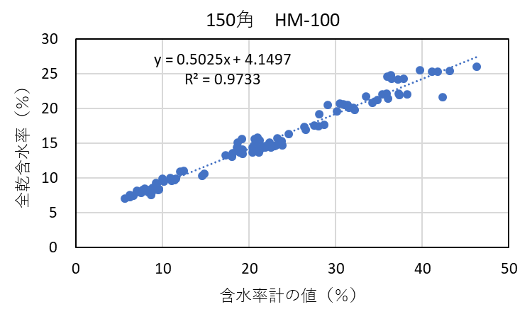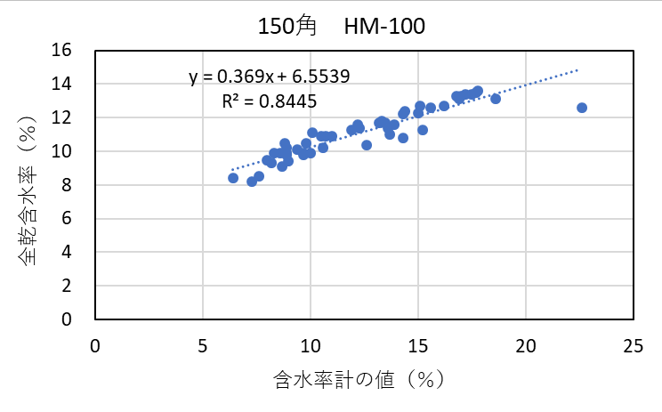 ![]() 図3-5 検量線作成用試験体の各切片に対する含水率計(HM-100)の値と全乾法による含水率の関係(スギ150角) |