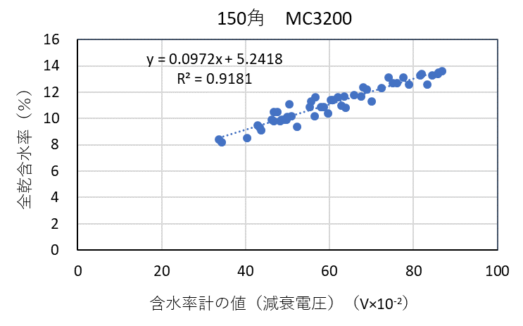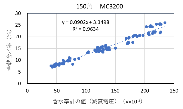 ![]() 図3-6 検量線作成用試験体の各切片に対する含水率計(MC-3200EX)の値と全乾法による含水率の関係(スギ150角) |