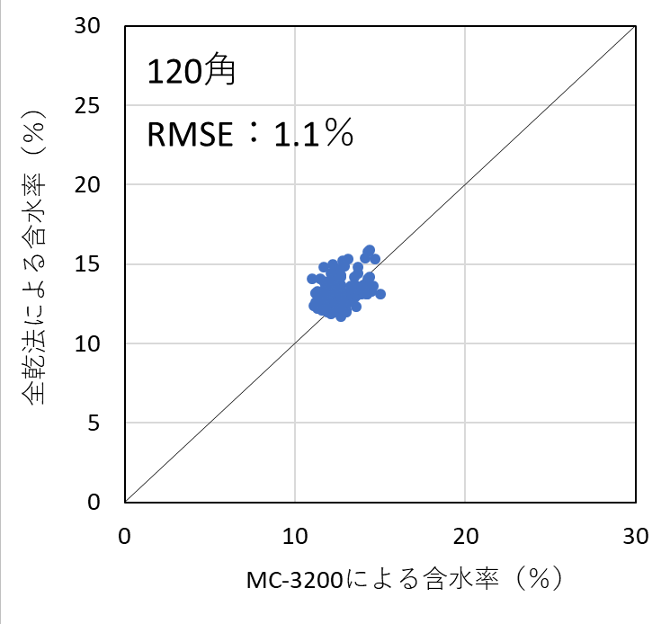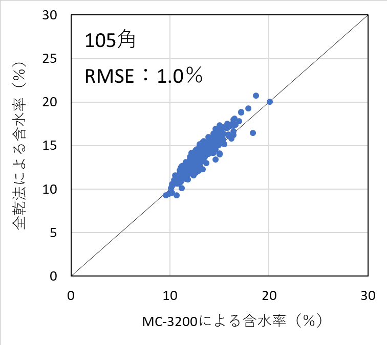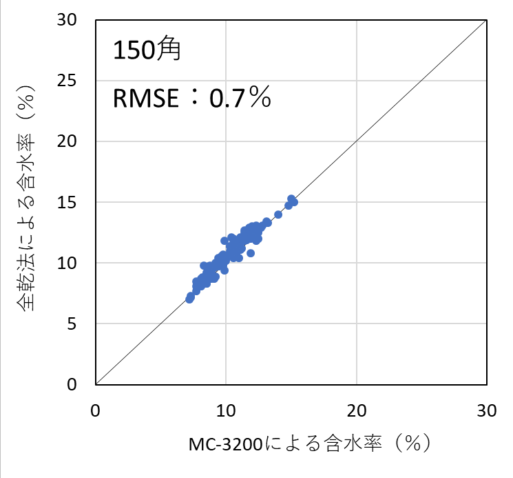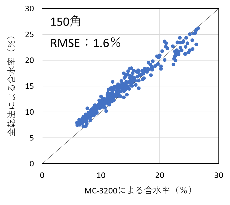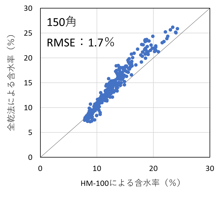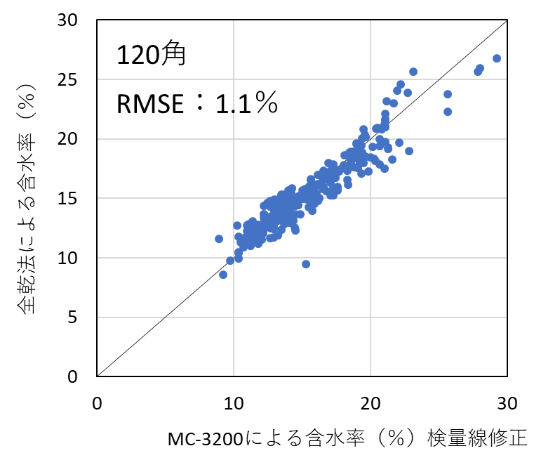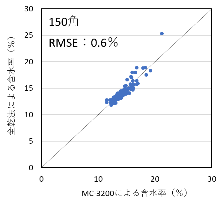 含水率計の測定精度を検証した結果、昨年度実施した105mm角の試験結果と同様、いずれの機種においても含水率を平均1%台の測定誤差(RMSE)で測定することができた。したがって、樹種および断面寸法ごとに適切に検量線を作成し、含水率の範囲を20%以下に限定して使用すれば、105mm~150mm角の正角乾燥材の含水率を高精度で測定可能であることが明らかとなった。