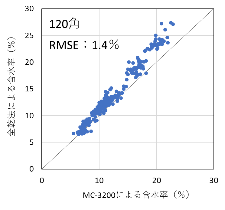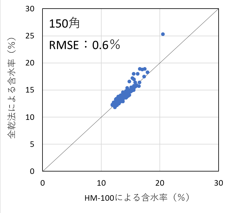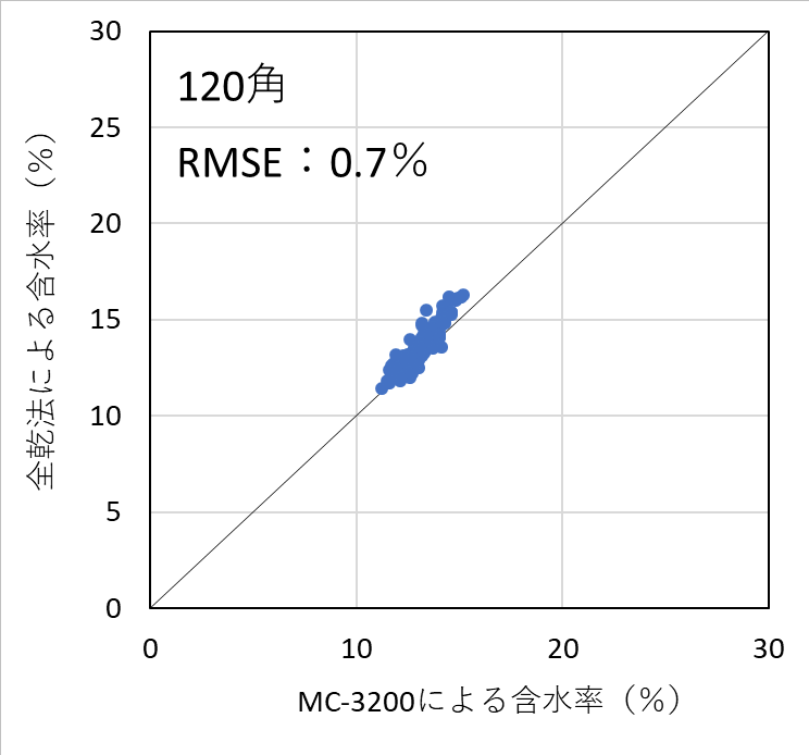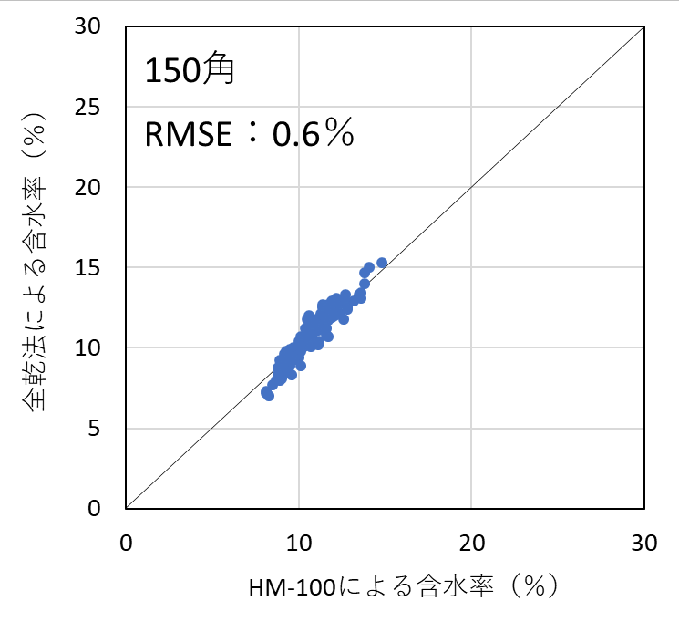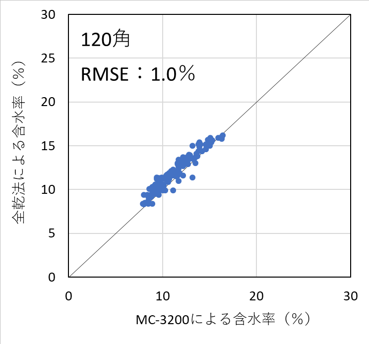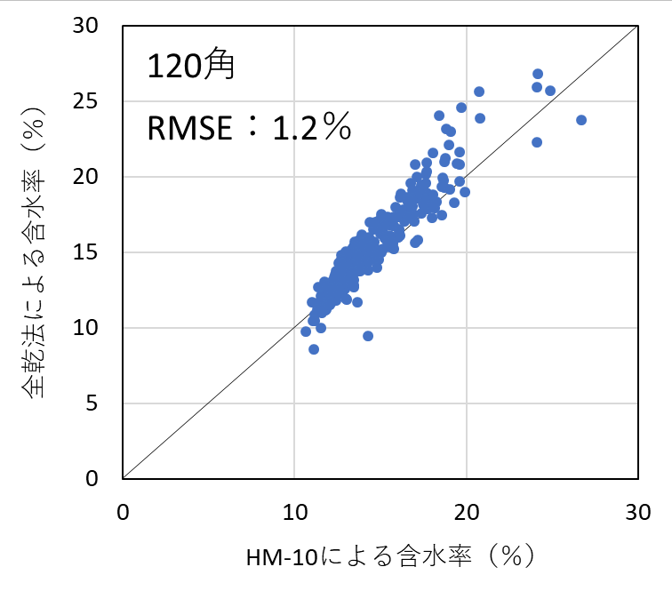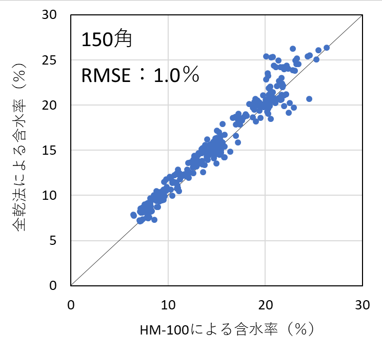 含水率計の測定精度を検証した結果、昨年度実施した105mm角の試験結果と同様、いずれの機種においても含水率を平均1%台の測定誤差(RMSE)で測定することができた。したがって、樹種および断面寸法ごとに適切に検量線を作成し、含水率の範囲を20%以下に限定して使用すれば、105mm~150mm角の正角乾燥材の含水率を高精度で測定可能であることが明らかとなった。