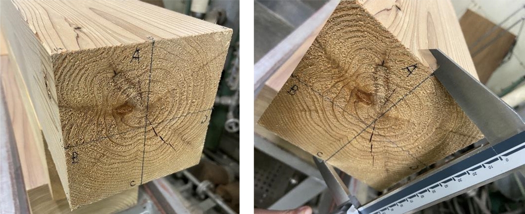 - 測定項目:設置場所の温湿度、重量、寸法、割れ、各材面の最大単独節径および最大集中節径