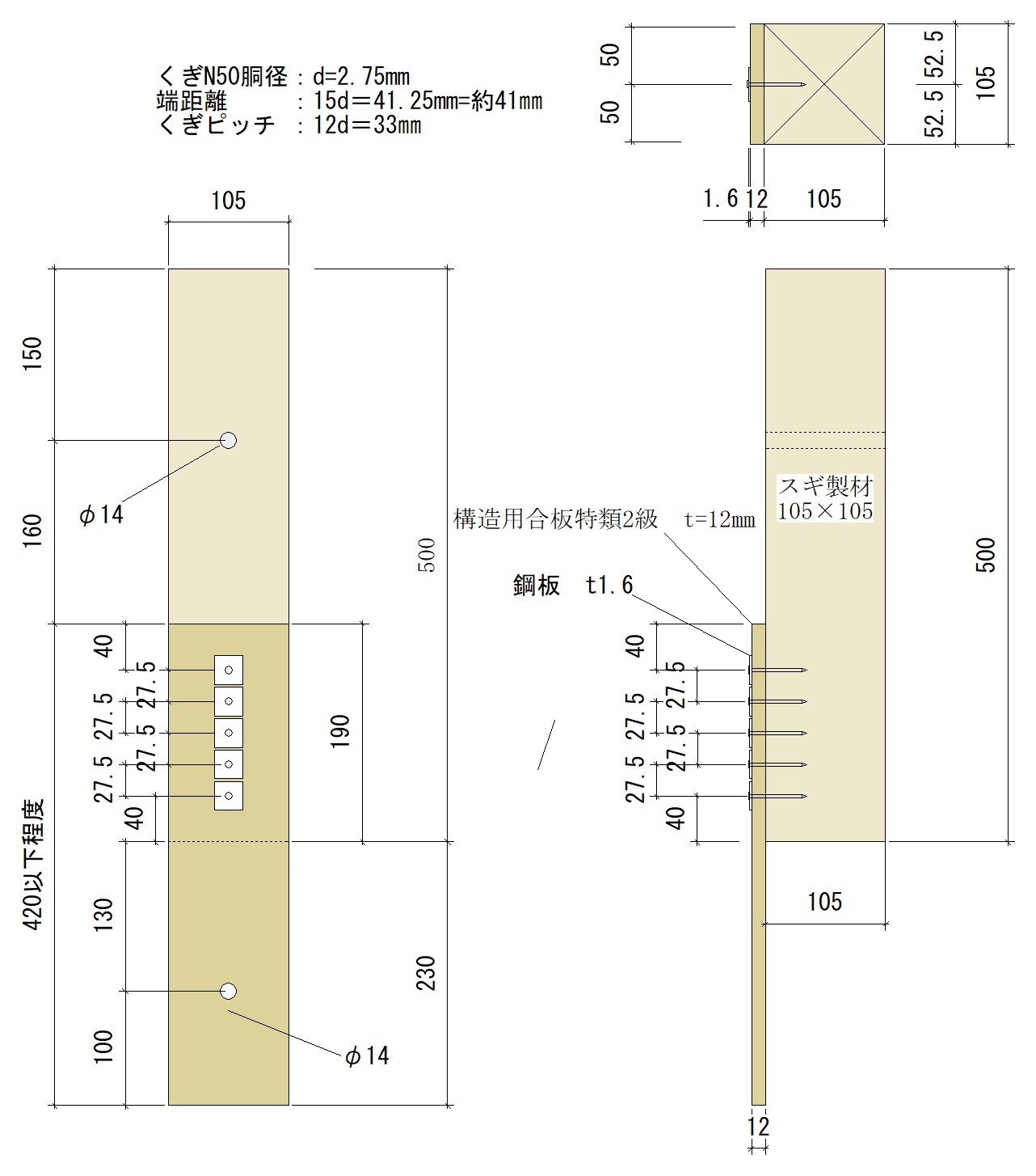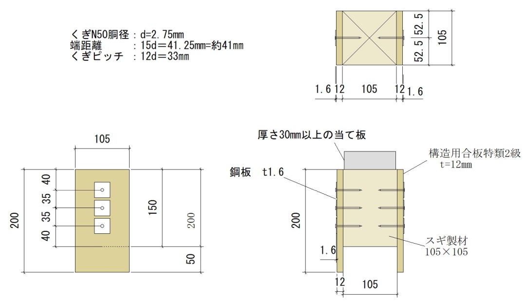 一方、AIJ規準は繊維方向加力12d(N50は33㎜)、直角方向加力10d(N50は27.5㎜)。