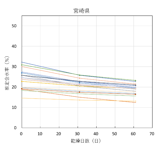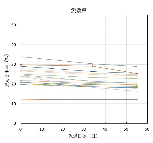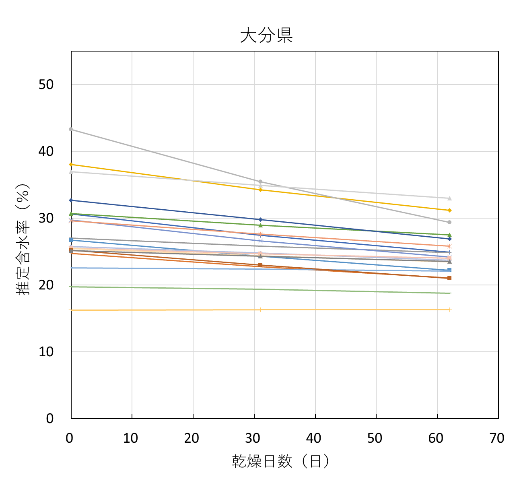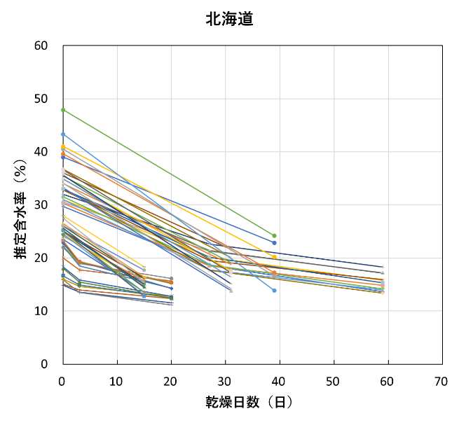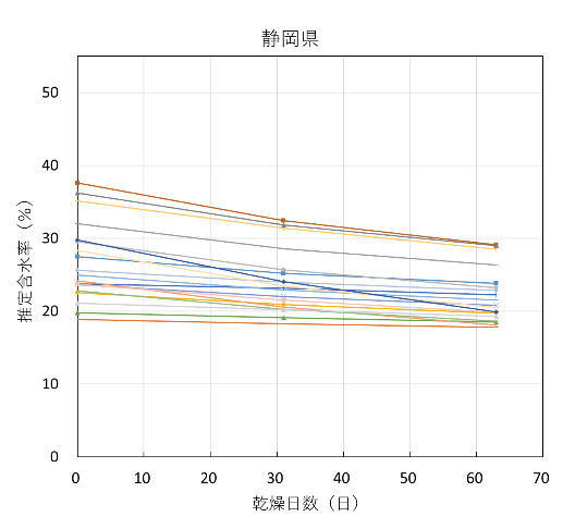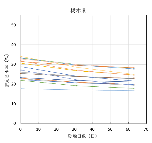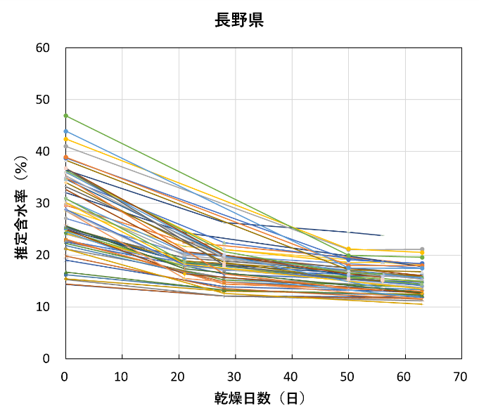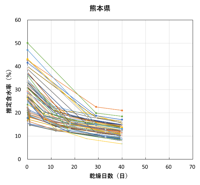 全試験体の推定含水率の推移を試験機関ごとに図8に示す。含水率が20%を下回ったあたりから、低下の度合いがかなり緩やかになっており、熊本県の一部の試験体を除くほとんどの試験体は含水率10%に到達しなかった。![]() |