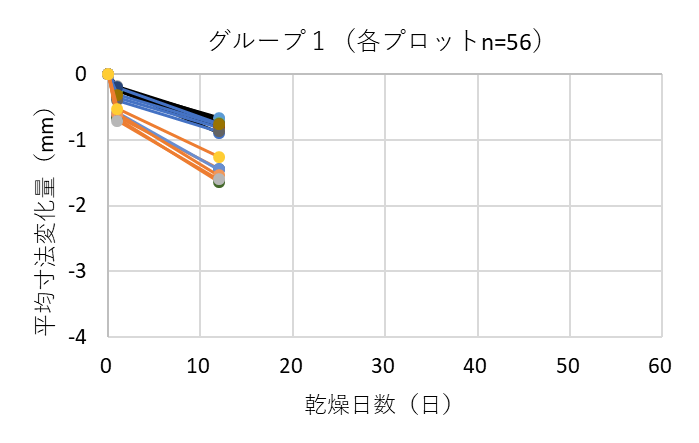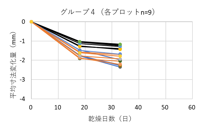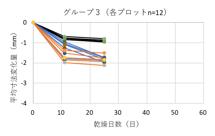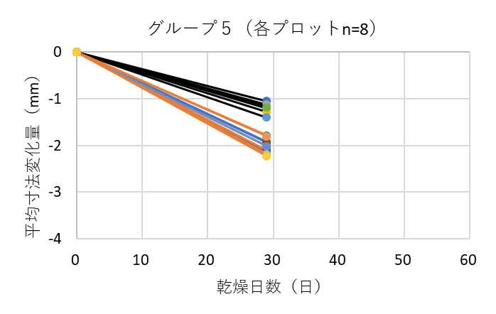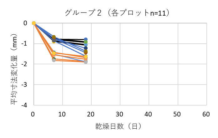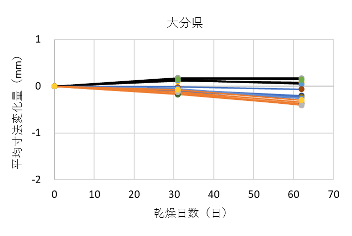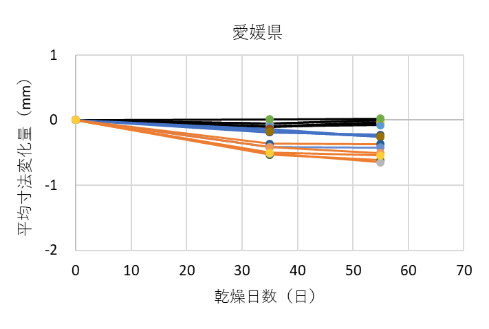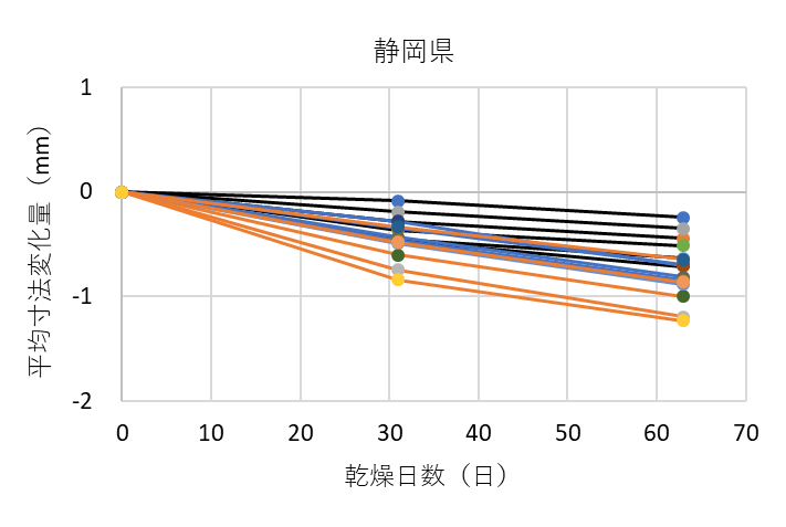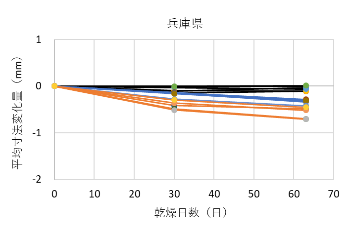 ![]() 図9. 各グループにおける測定箇所ごとの平均寸法変化量(熊本県の例) 黒線は木口面、青線は中央、オレンジ線は切断面を表す |