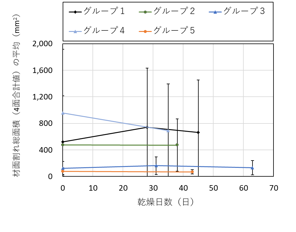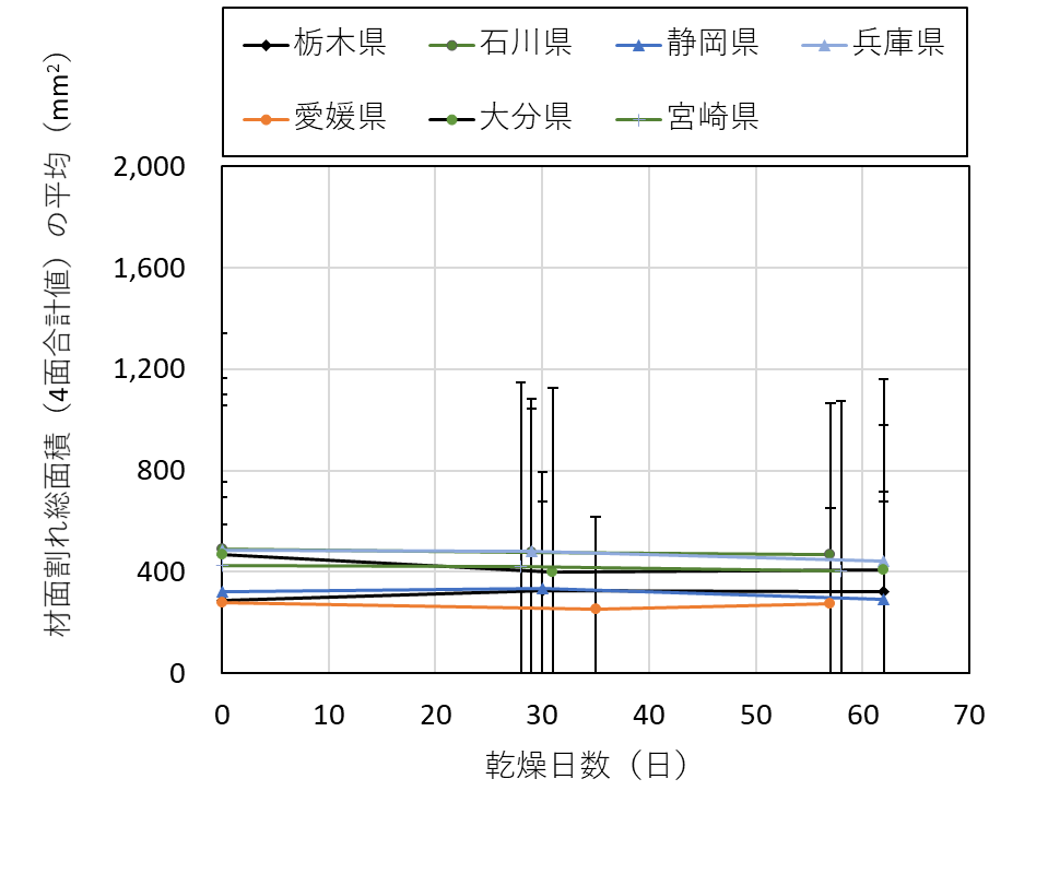 ![]() 図16 材面割れ総面積の4面合計値の平均および標準偏差 |