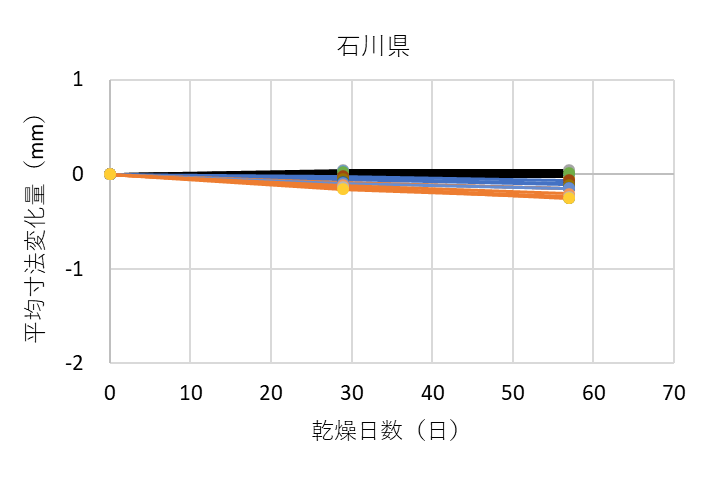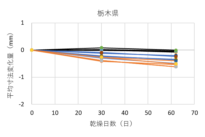 ![]() 図13 各試験機関における測定箇所ごとの平均寸法変化量 黒線は木口面、青線は中央、オレンジ線は切断面を表す |