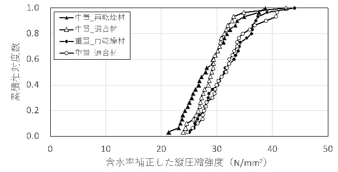 実験結果から得られた縦圧縮強度を含水率補正した累積相対度数を図17に示す。なお、含水率補正は、ASTM1990-07の方法で含水率15%となるようにした。![]() 図17 重量選別並びに判定別の含水率補正した縦圧縮強度の累積相対度数 |