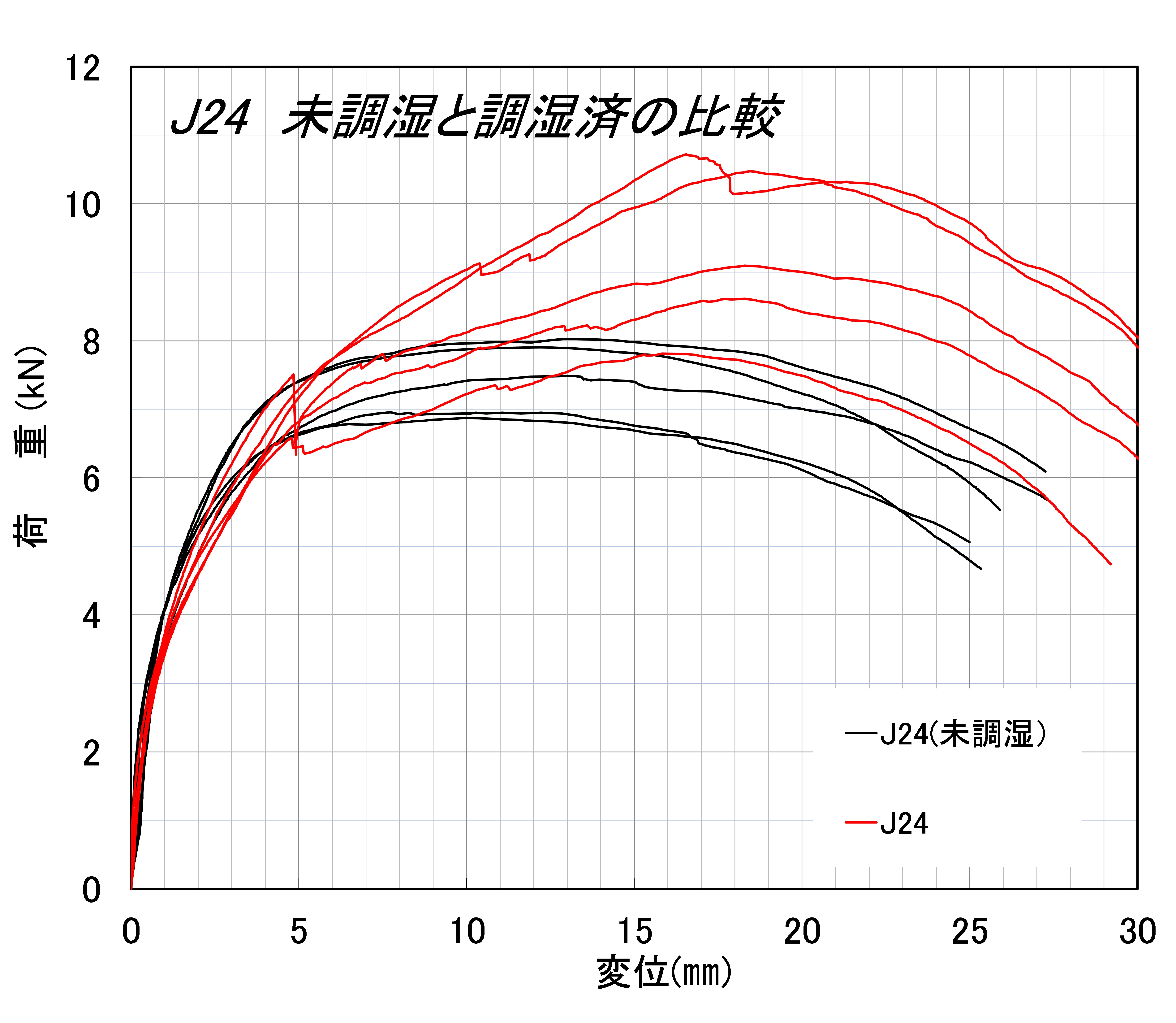 各試験体について加重変位曲線を測定した。図18はJ24(未調湿)とJ24を比較したものである。グラフの形状から含水率が高いままだと荷重は上がらないが、乾燥させるとJ24のようにロープ効果が発現し、最大耐力が上昇しているように見える。