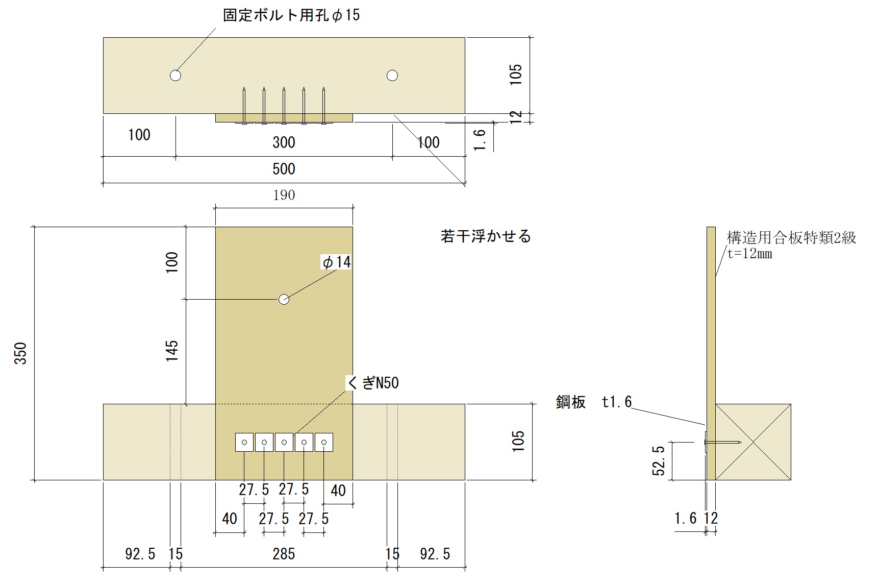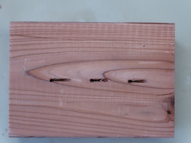 - くぎの種類については、細い方が割れに対して木材への支圧が効きにくい。太い方が割裂を引き起こしやすいという違いがある。ビスとの差別化を図るため、N50を採用する。
