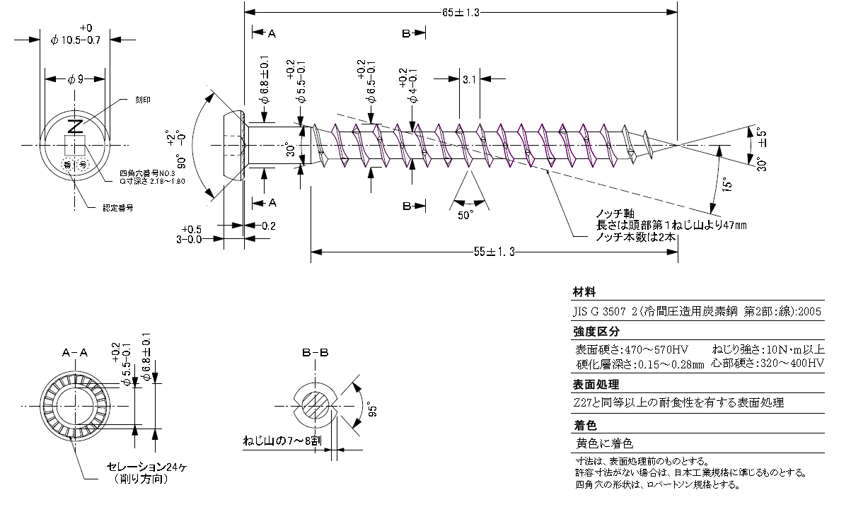 - 使用するビスはR3要素試験と同様、図28のとおりZマーク表示金物用四角穴付きタッピンねじSTS・C65を使用する。