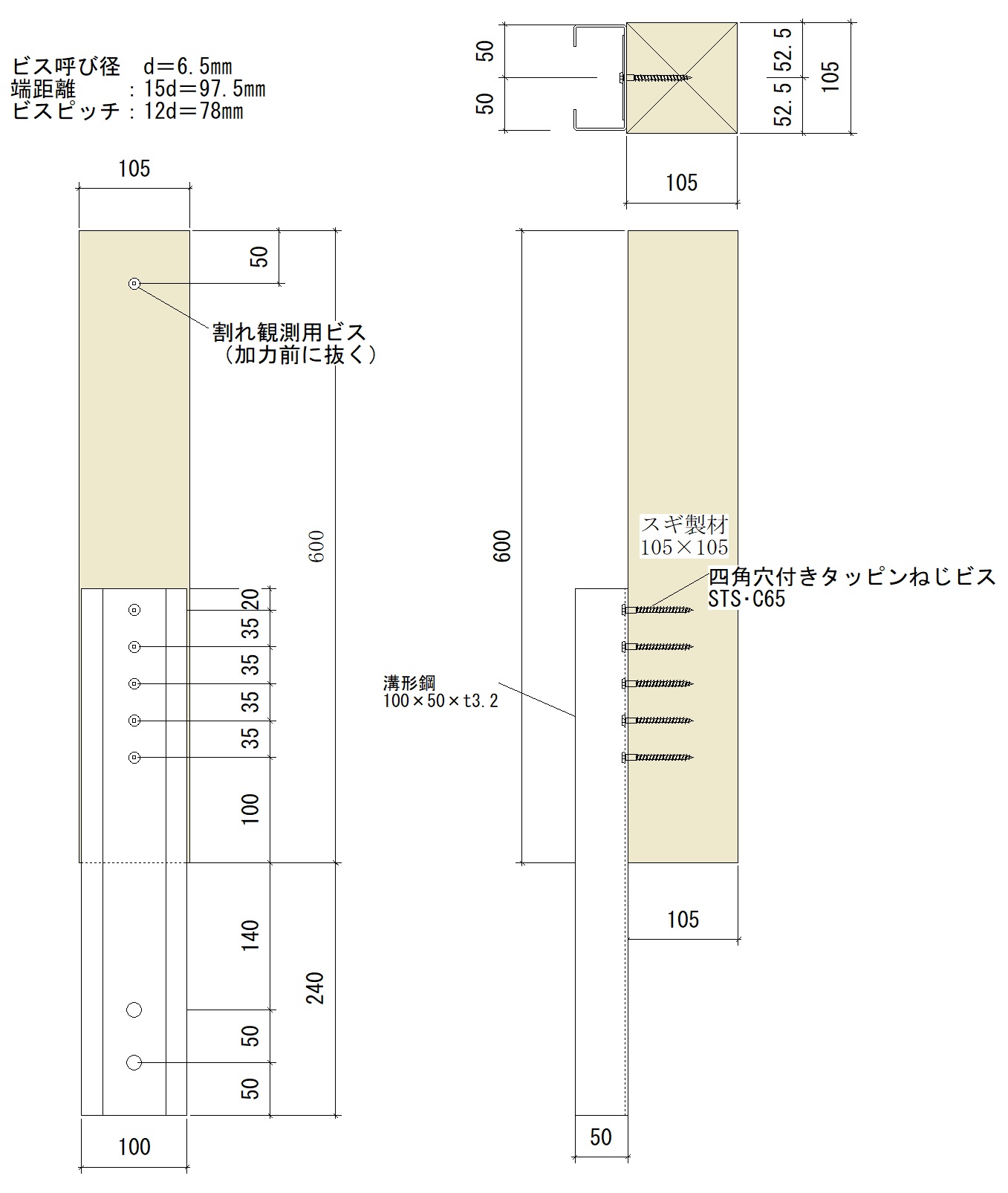- ビスピッチは、(1)より35㎜とした。材端からの端距離はAIJ規準より15d=97.5㎜≑100㎜とした。