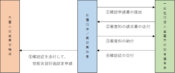 事業者は、外国人技能実習機構への技能実習計画認定申請の際に、技能実習計画書等の必要書類と併せて、全木連から交付された確認証を、外国人技能実習機構に提出してください。