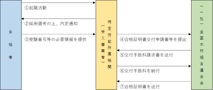 「(A)合格証明書交付申請書」及び「(B)合格証明書交付申請者名簿」を作成し、「(C) 木材産業特定技能協議会構成員資格証明書」、「(D)合格者と雇用契約を締結したことを証明する書類の写し(合格者の自署必須)」と併せて、電子メール又は郵送で全木連へ提出してください。