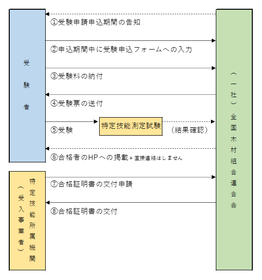国内試験の受験者は、全国木材組合連合会(以下、「全木連」という。)の「木材産業分野特定技能1号測定試験」受験申請フォームに必要事項を入力して受験の申請をしてください。受験申請フォーム(試験実施情報)はこちら