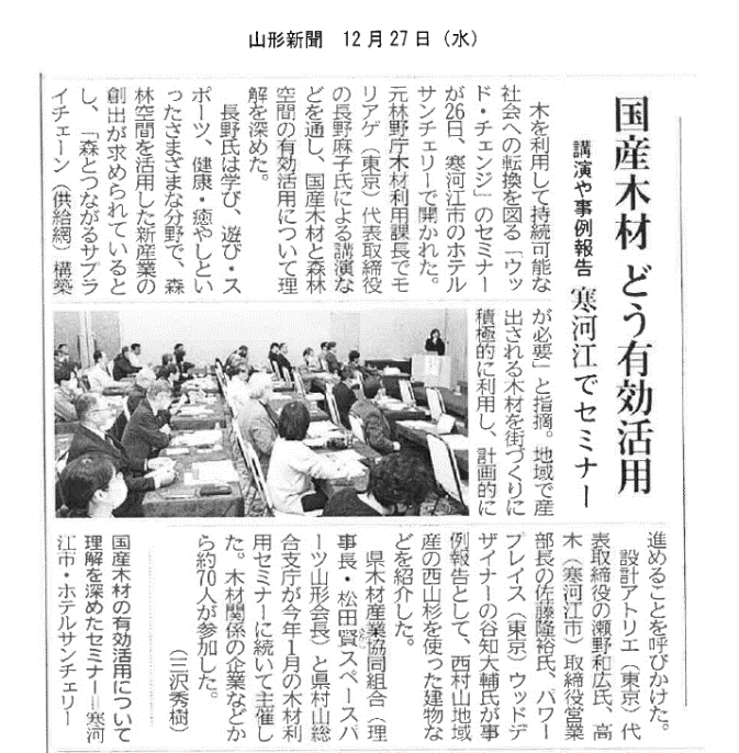 | ① | 日時:令和6年1月22日(月)13:00~、1月23日(火)13:00~ 22日:新春木造建築・木材流通セミナー(木産協及びJAS製材連絡協議会等共催) (東京都市大学名誉教授:大橋氏講演会)(他事業) 23日:山形県森林協会(新春講演会) (東北専門職大学学科長:柴田氏講演会:木産協共催事業) |