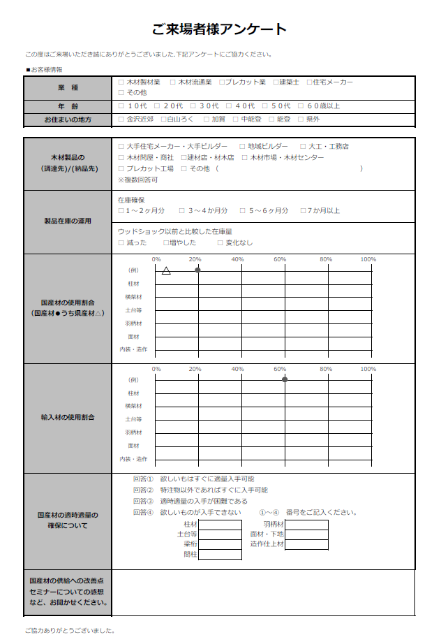- 非住宅の県産材利用の補助は、5月早々に予算が無くなった。今後は予算も増やしてほしい。