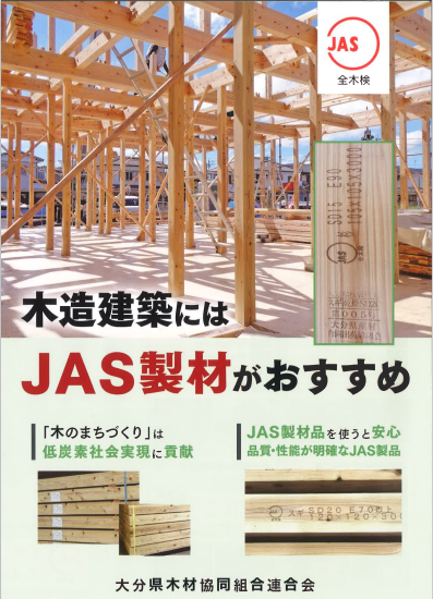 大分県内のJAS認証工場17社の紹介を含めたJAS製材品の普及版のパンフレットを作成し、流通業者・建設業者・設計事務所等に配布